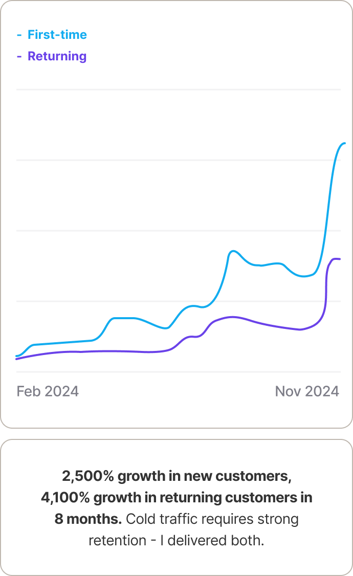 Before launching a single campaign, I review your website, unit economics, product strategy, other channels, and brand positioning. Agencies don’t do this. I do it because I believe it’s the only way to make your ads actually work long-term.